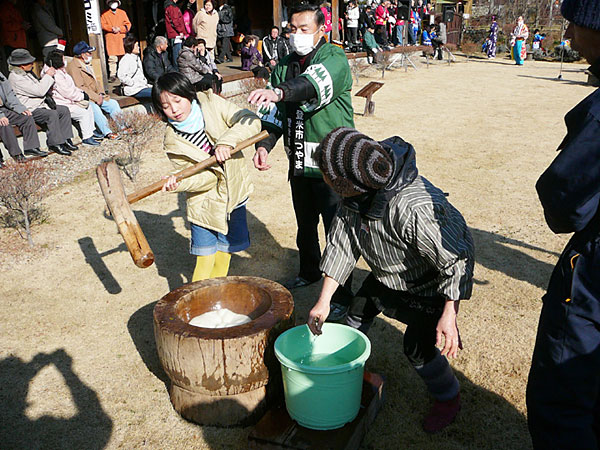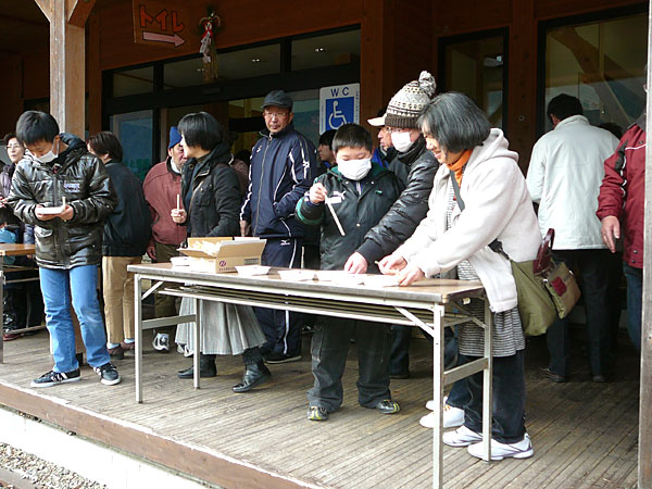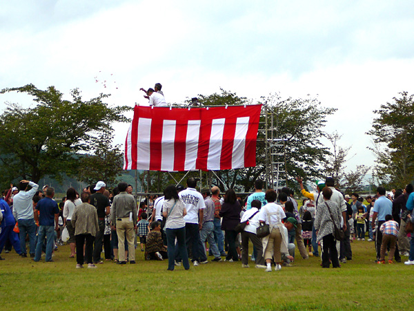 お徳なくじが101個入った福もち5000個を特設やぐらの上からまいていきます!